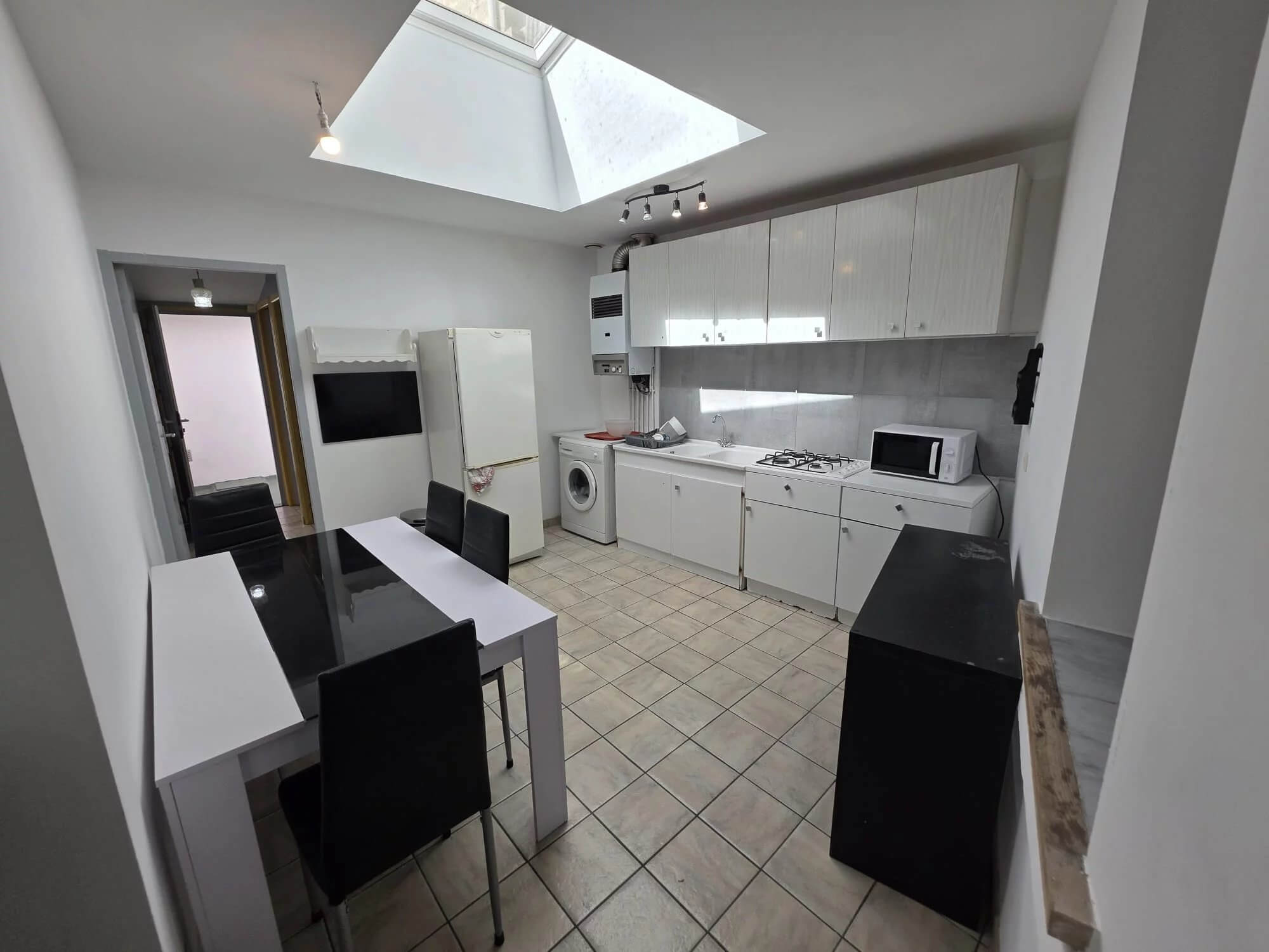 RDC : Salon/salle à manger qui donne sur une grande cuisine aménagée, SDB, WC et accès cave.