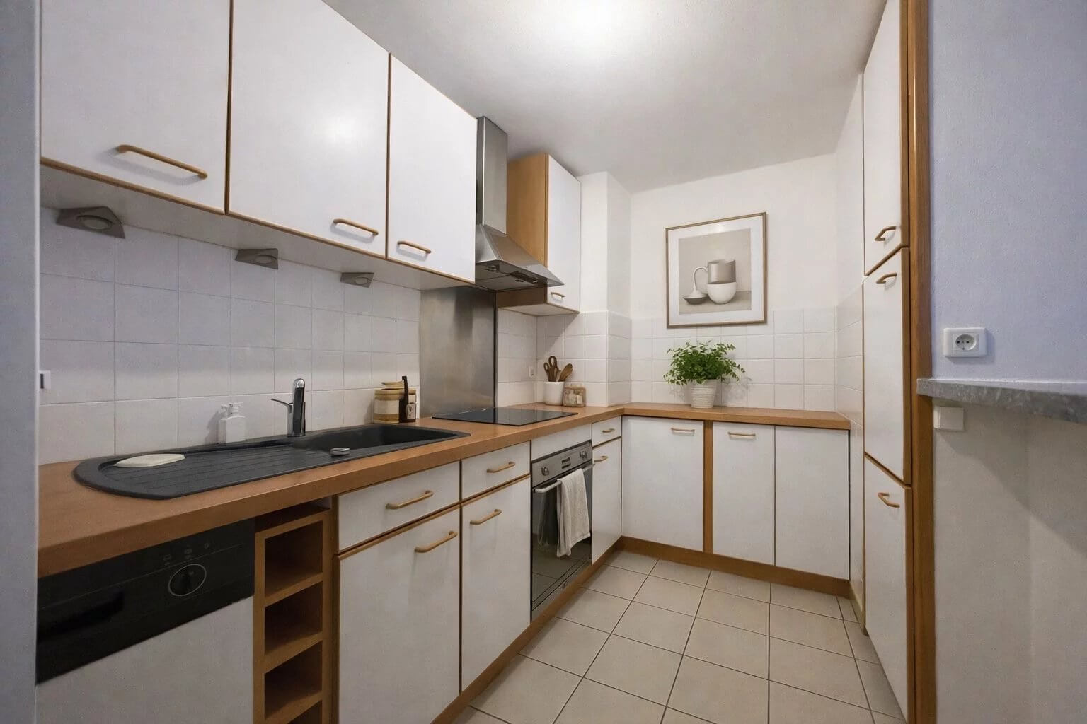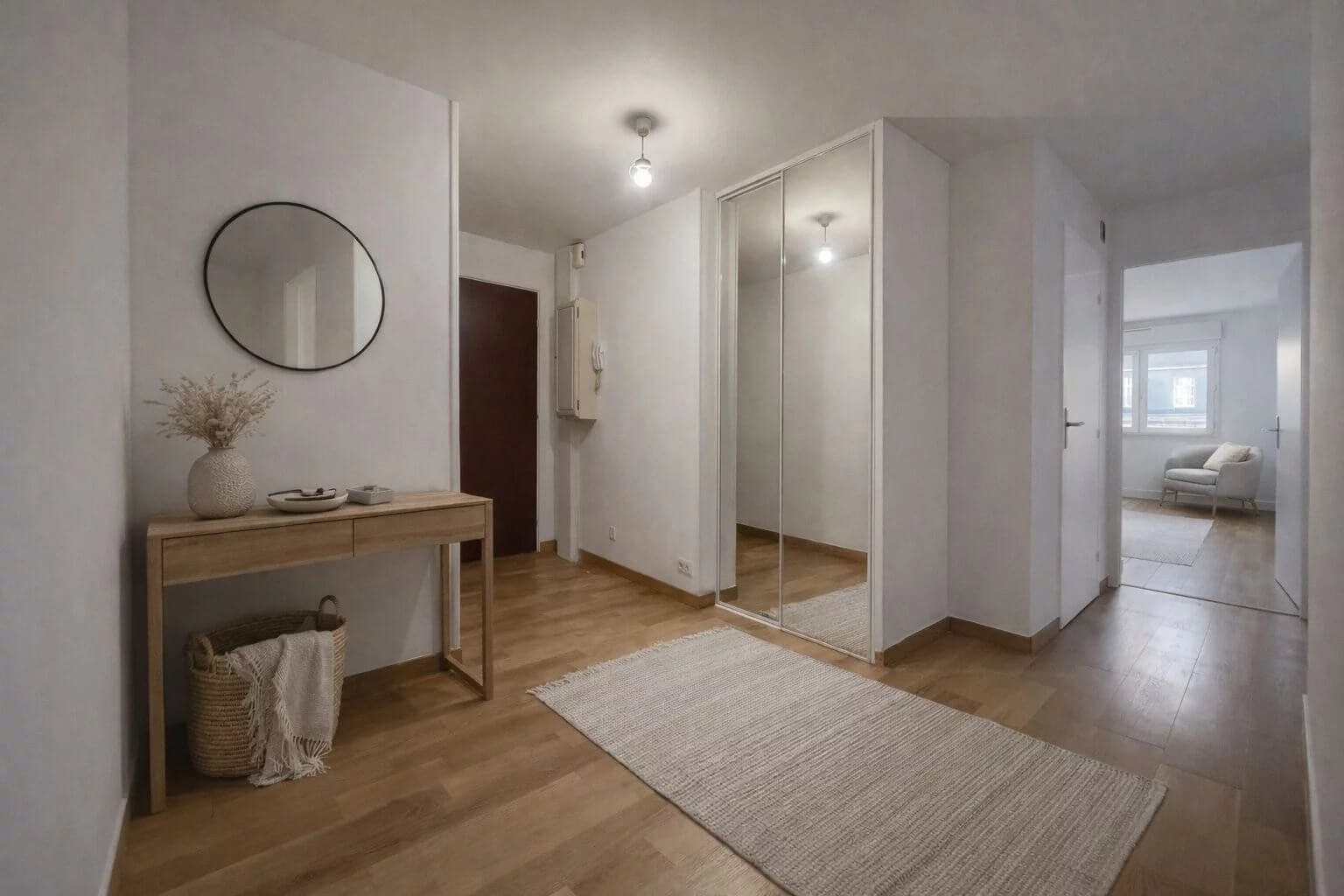 Hall d’entrée avec placard intégré desservant un magnifique salon/séjour, une cuisine équipée, deux grandes chambres avec placard dressing intégré, une salle d’eau (avec un meuble vasque, une douche et un branchement pour machine à laver) et wc séparé.