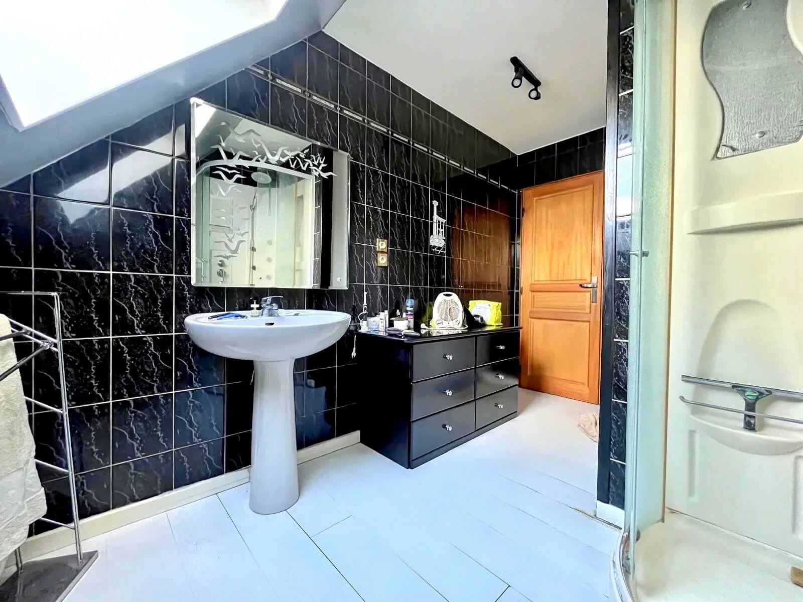 RDC : Grand espace de vie de plus de 80m² avec cuisine aménagée et équipée, 1 chambre, salle de bain, WC séparé.