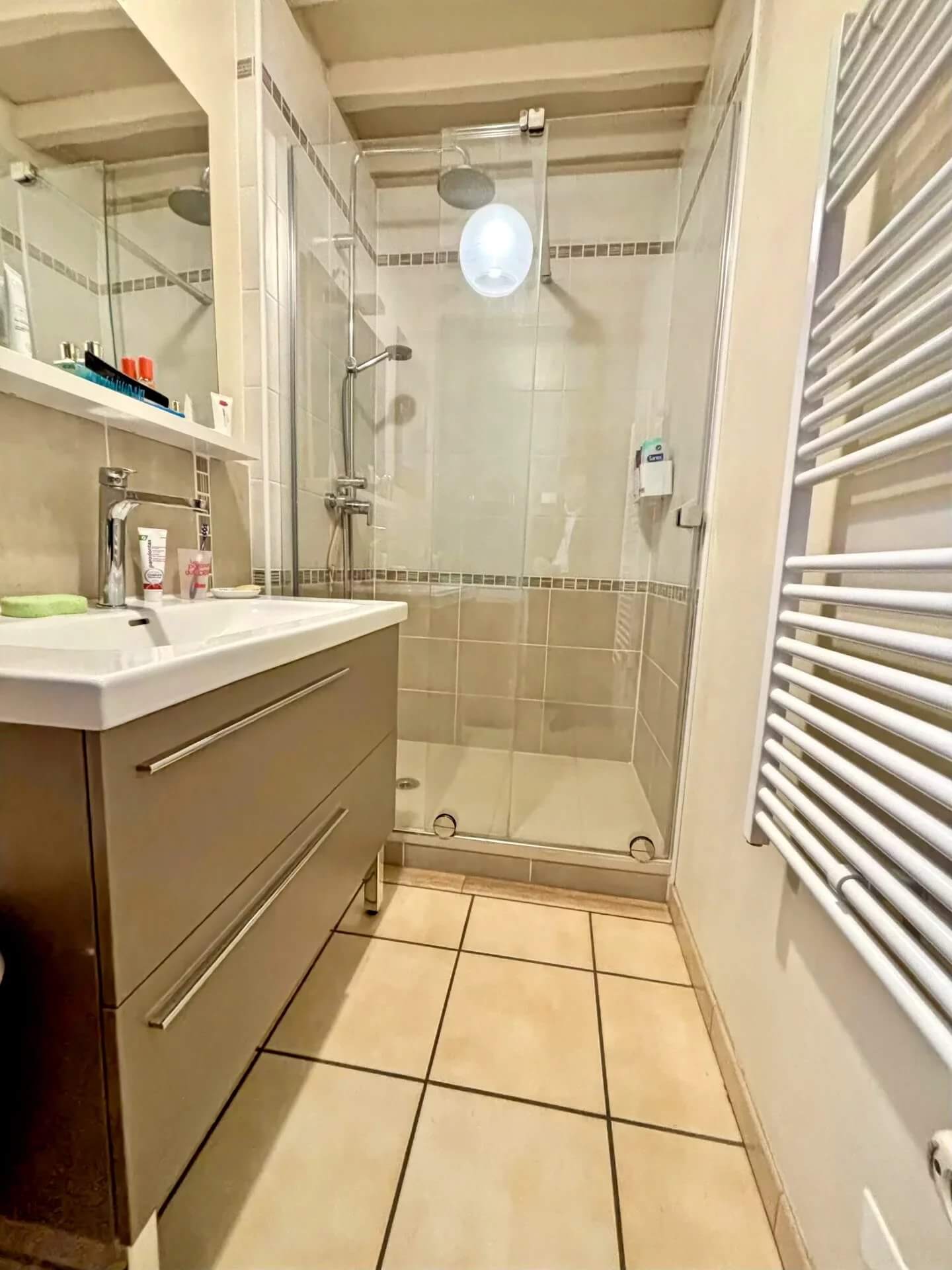 RDC : Entrée, Grand espace de vie ouvert sur cuisine aménagée, 1 chambre, salle d’eau, WC séparé et cellier.